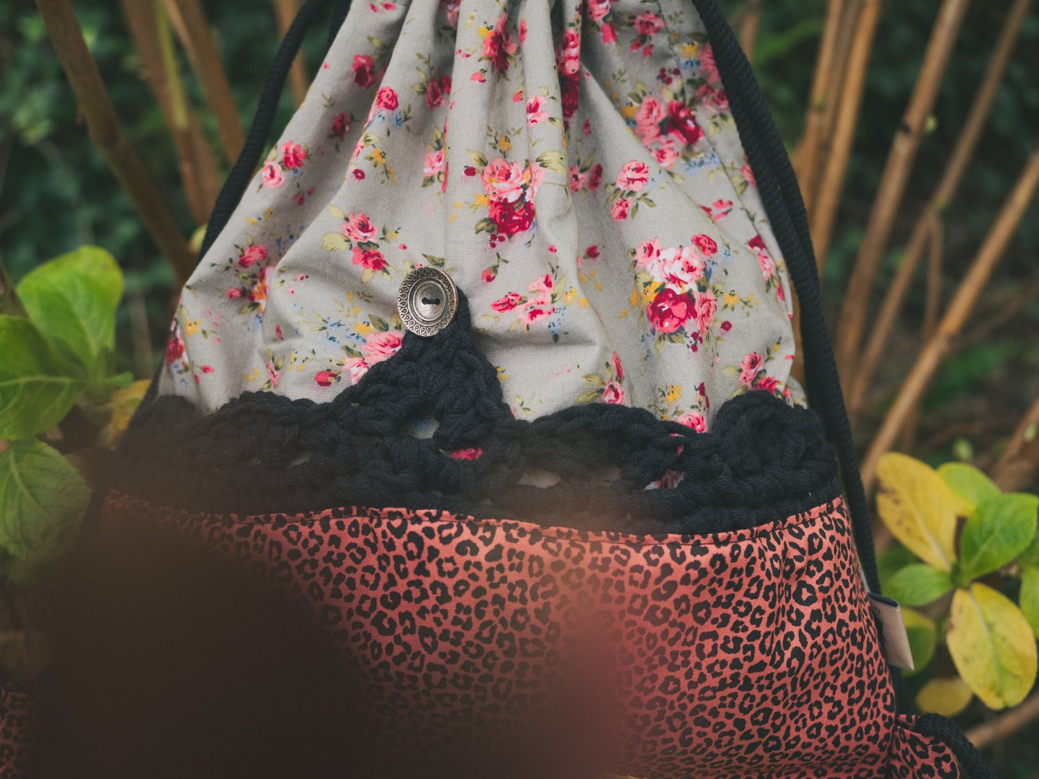 Mochila que lleva un bolsillo de tejido y puntilla tejida a ganchillo que se sujeta con un botón especial. Lleva forro por dentro convirtiéndolo más consistente.