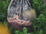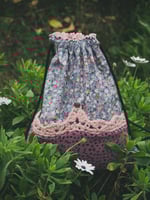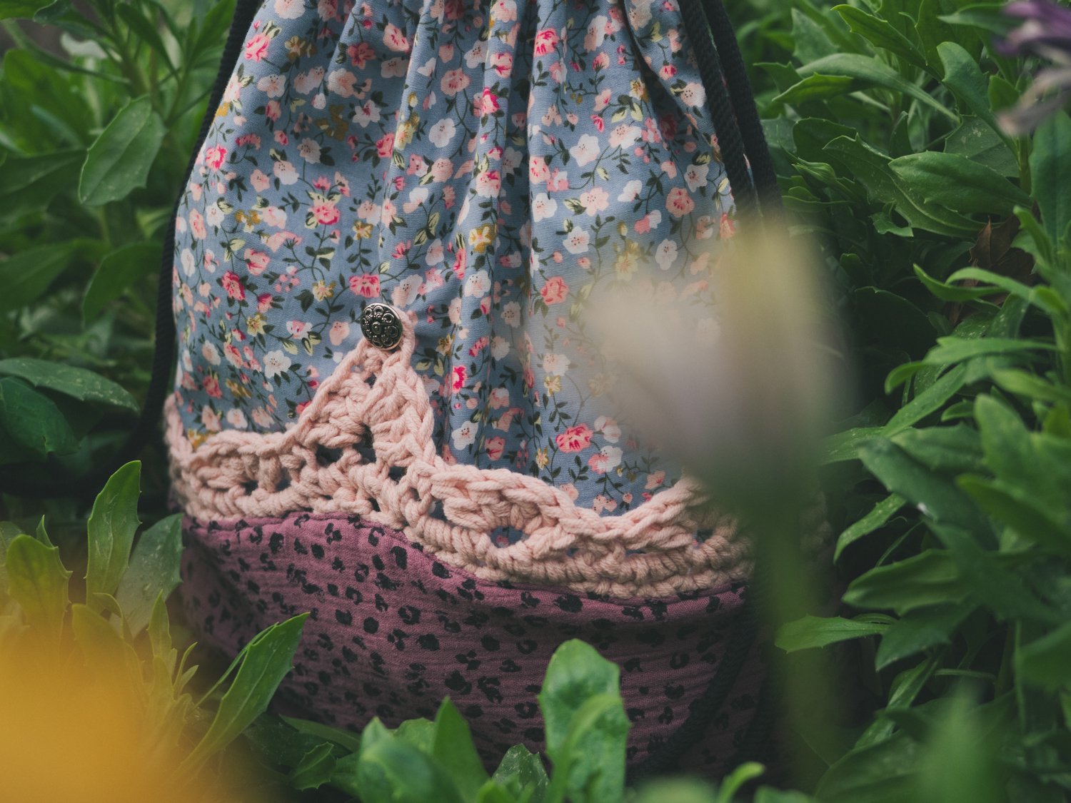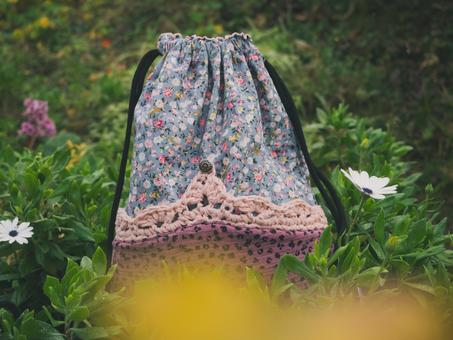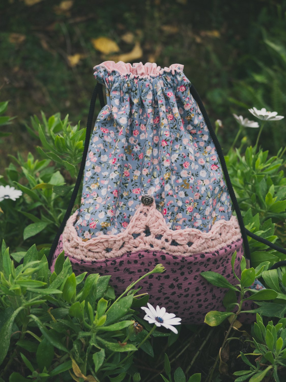 Mochila que lleva un bolsillo de tejido y puntilla tejida a ganchillo que se sujeta con un botón especial. Lleva forro por dentro convirtiéndolo más consistente.