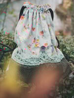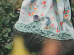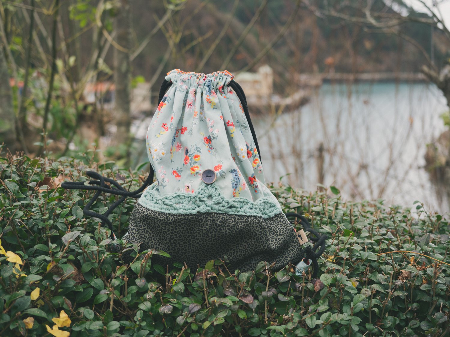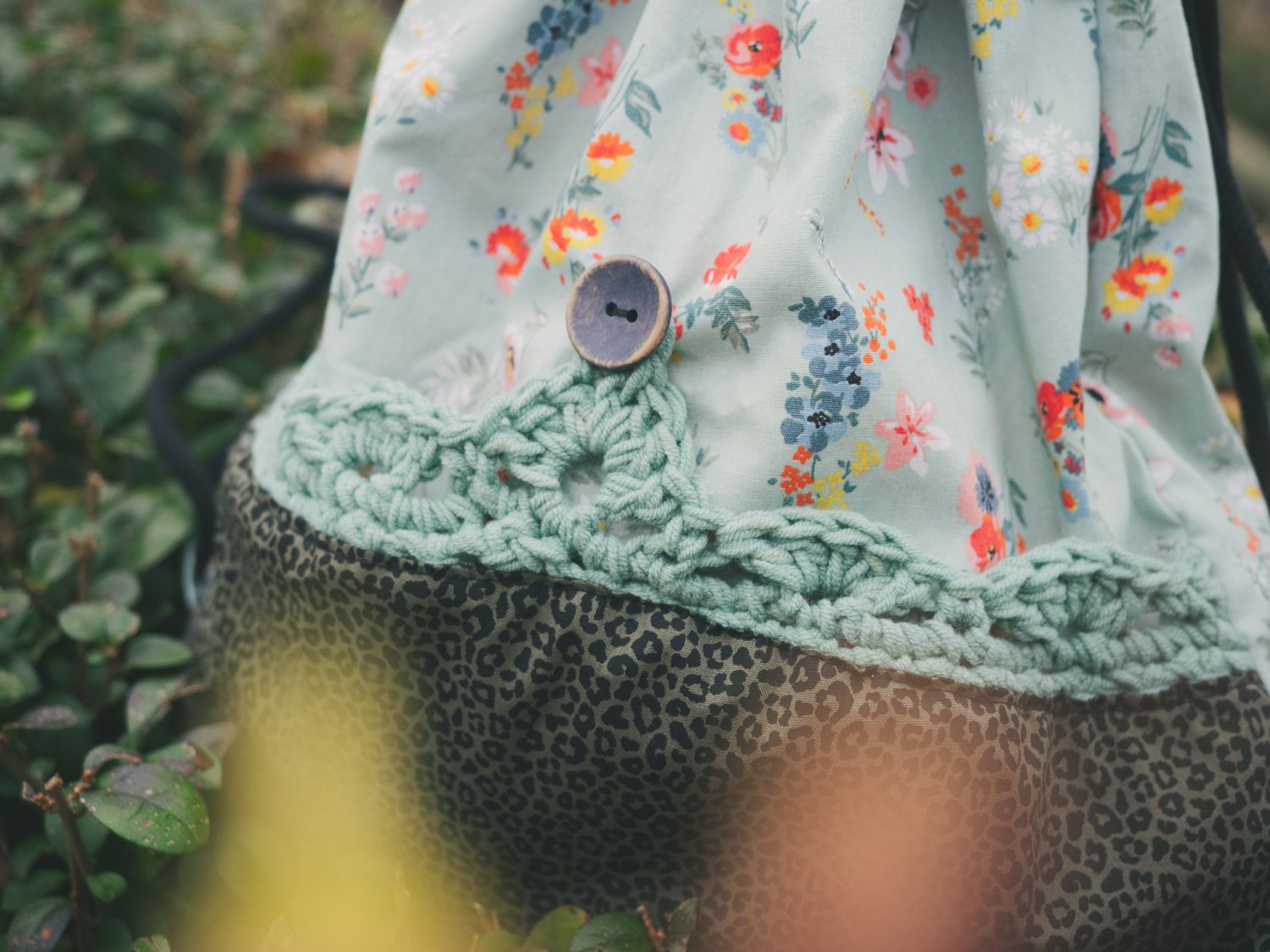 Mochila que lleva un bolsillo de tejido y puntilla tejida a ganchillo que se sujeta con un botón especial. Lleva forro por dentro convirtiéndolo más consistente.