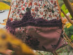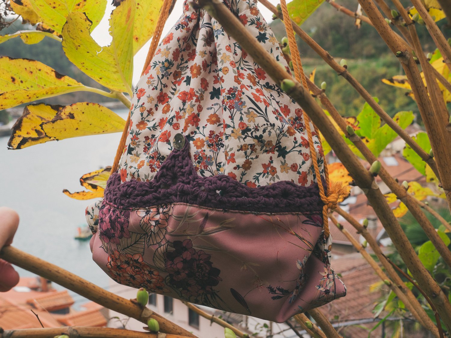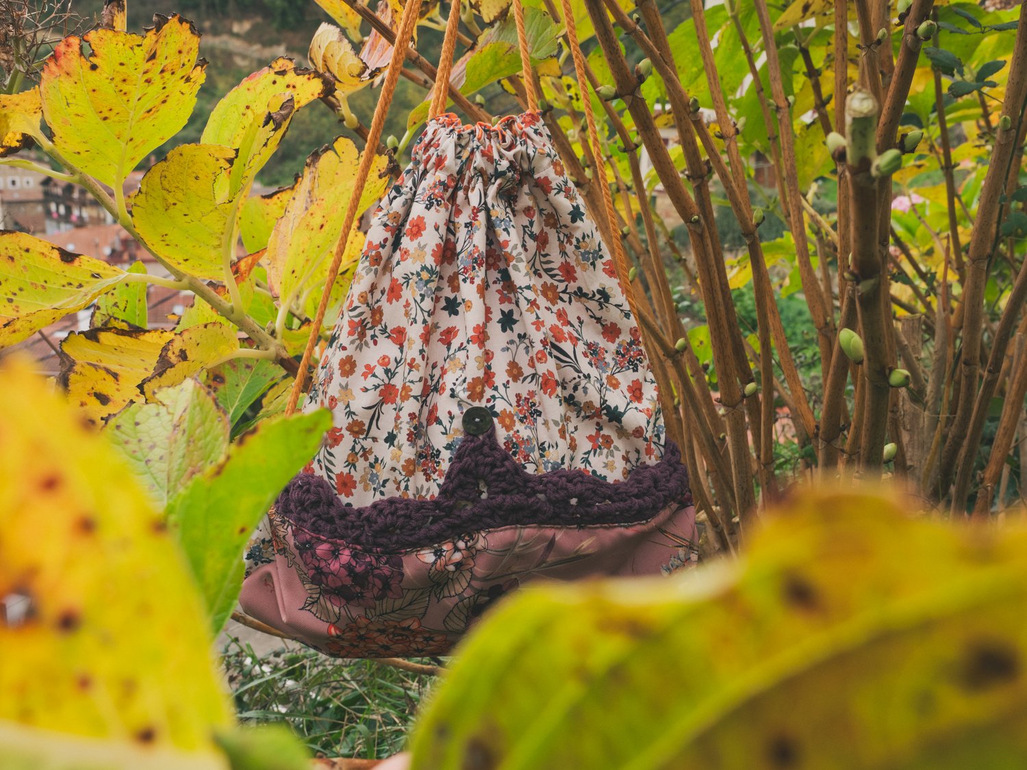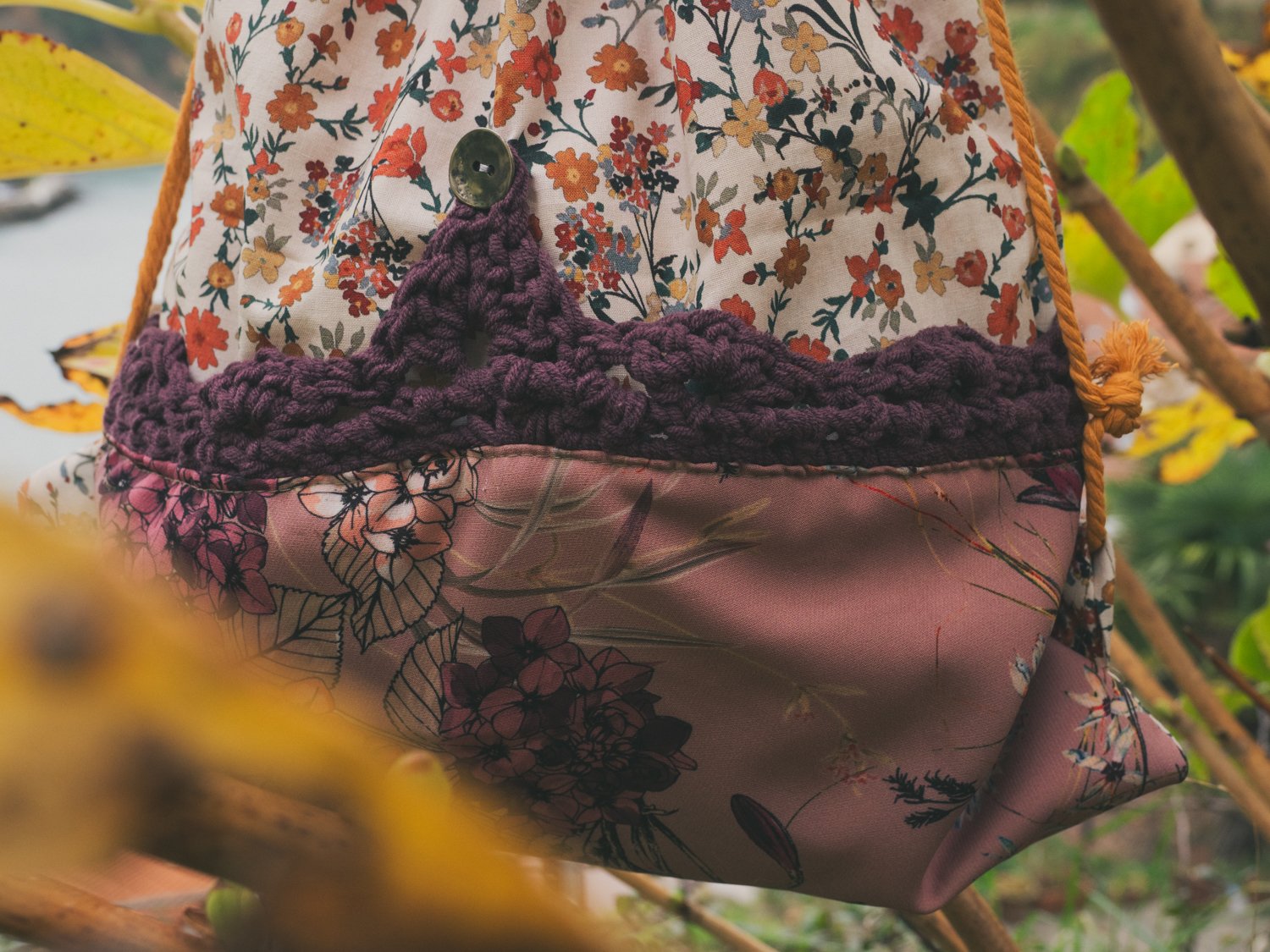 Mochila que lleva un bolsillo de tejido y puntilla tejida a ganchillo que se sujeta con un botón especial. Lleva forro por dentro convirtiéndolo más consistente.